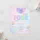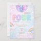 Gör dig redo för fest med denna roliga och färgglada födelseinbjudan! Med en glittrande diskoboll, mjuka pastellregnbågar, moln och lekfull typografi är denna inbjudan perfekt för att fira en magisk 4-årsdag.