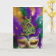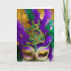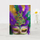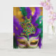 Lustigt Mardi Gras-parkeringskort med maskerad mask med fjädrar och pärlor i grönt och lila.