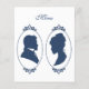 Fintvätt blått och vit ros med Bridgerton ReEmergency-stil-accents omger två klassiska kameror av en kvinna och en annan man, alla mot en skarp vit bakgrund.