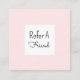 Vit referenskort för rosa/kundförmånskort med enkel bakgrund för rosa. Detta referenskort för elegant kan användas för skönhetssalon och spa, hårkonst, hårfrisörtjänster, manikyr-/pedikyrtjänster, massageterapeut och många andra tjänster. Ta en titt på vår butikssamling nedan om du vill ha fler produkter med den här designen. Du kan också ändra bakgrunden färg medan du redigerar designen.