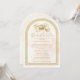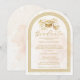 The combination of soft beige tones and the architectural arch shape conveys a sense of refined celebration, pride, and timeless academic achievement. The design maintains a minimalist yet distinguished aesthetic that allows the invitation text to stand out clearly while remaining surrounded by subtle decorative elements that provide balance and visual harmony.