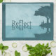 Ett grönt-blått texturerat teckning med en silhuett av en man sitta under träd under en damm som funderar på. "Reflect" från ord vilar på sjö yta, texten och skuggorna som speglas i det helt stilla vatten.