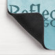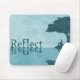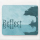 Ett grönt-blått texturerat teckning med en silhuett av en man sitta under träd under en damm som funderar på. "Reflect" från ord vilar på sjö yta, texten och skuggorna som speglas i det helt stilla vatten.