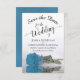 Det här bröllop spara datum-kortet är romantiskt, elegant, klassigt och vackert. Den har ett foto av en enda lång himlar-blått, turkos eller azure-färgad ro som reflekterar i bassäng i vatten med vågar och krusar. Texten är en kalligrafi av skript i finare på en vit bakgrund. Baksidan har en underbar marmorerad mönster. Perfekt för att informera dina vänner och din familj om ditt kommande bröllop.