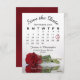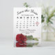 De vackra "Save the Date"-korten har ett fantastiskt foto av ett enda, långt, härdat röd ros som reflekterar i vatten med vinkara och kramper. Kortet innehåller en kalender med bröllop-datum i rött hjärta. Snygg romantisk design.