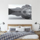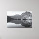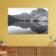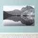 Ett enfärgat fotografi fångar en scen vid Serene Silver Sjö. Det stilla vatten återspeglar perfekt de omkringliggande bergen och träd och skapar en speglad effekt. Bergarna är stiga upp i bakgrunden, deras bergiga yta i skuggor av grått. En linje med träd hamnar vid kustlinjen och lägger till djupet i sammansättningen.