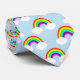 Lysa upp vilken outfit som helst med ett upprepat mönster av flerfärgade regnbågar och fluffiga vita moln på en himmelblå bakgrund.