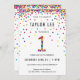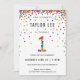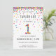 Regnbåge 1:a födelsedag/första födelsedagsfest inbjudan! Med information om barn och ett "1" i konfetti, med konfektyrcirklar för färgad av roligt som sprider sig uppifrån dessa söta inbjudningskort