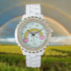 Lägg till en liten bit stollig till din garderoba med vår Rhinestone White Enamel Watch. Det här fantastiska tidsstycket har en känslig regnbågsdesign på ansikte, med rosa hjärtan i varje ände och små stjärnor spridda runt den, allt mot en ljusblå bakgrund. De mousserande rinestonerna på ramen tillför en lyxig beröring, skapar den här klockan både lekfull och elegant. Perfekt för alla tillfälle, denna klocka kombinerar charm och sofistikering. Det vita emelbandet ser till att det passar bekvämt, medan den färgstarka designen ger dig en trevlig och upplyftande bild till din dag. Låt denna vackra klocka vara en påminnelse om att alltid leta efter regnbågen efter regnet.