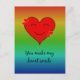 "Du får mitt hjärta att le" är citatet på detta söta och färgglada vykort. Romantik och lycka tillsammans, det är vad sann kärlek handlar om. Ett stort rött hjärta med ett leende ansikte och två par mindre röda hjärtan på en regnbågsfärgad bakgrund.