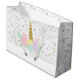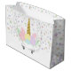Enhörning presentpåse med söt glad enhörning ansikte med blommor och horn på en fin pastellprickig bakgrund. Dessa enhörning baby och barn presentpåsar kan personifieras med text och du kan lägga till en bakgrundsfärg.