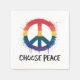 En vibrerande fredstecken-symbol som återges i regnbåge i färg med en stänk och droppeffekt som ställs in mot en vit bakgrund. Under den står frasen "VÄLJ FRED" skriven i ett fet, penseldrag, som förmedlar ett budskap om enighet och harmoni.