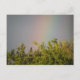 Det här vykortet har ett vackert landskapsfoto av en regnbåge överst på lite träd. Fotografiet togs omedelbart efter en regnstorm för att fånga regnbågens levande färg. Omgivande himlar är grått med molntäcke.