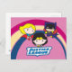 Kolla in Chibi Supergirl, Chibi Woman och Chibi Batgirl framför en regnbåge som sträcker sig från en blå logotyp i Justice League.