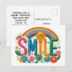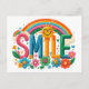 Ta en kort dag med det här vackra vykortet. Med en glad framdesign med färgstarka blommor, regnbåge och ord "Smile" ger den värme och positivitet. På baksidan finns ett hjärtligt budskap och utrymme för mottagarens adress.