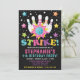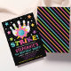 Regnbåge Neon Bowlings Födelsedagsfest Inbjudan. Denna design har bowling käglor, en bowling boll och stjärnor. Ljus regnbåge neonfärger sticker verkligen ut mot den svarta bakgrunden. Anpassa denna anpassade inbjudningsdesign med dina egna festdetaljer.