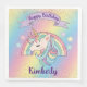 Den här söta och färgstarka napkin i anpassningsbar har en vacker illustration av en regnbåge för enmajs och pastellform i färgad, över en regnbågsbakgrund. Faux guld glitter accentuerar överdelen och grund. Små stjärnor i matchande färg omger regnbågen. Ett exempel på en Grattis på födelsedagen-banderoll skrivs ut ovanför encorn och ett exempel på namn skrivs ut nedan i ett elegant lila-skriptteckensnitt. Du kan anpassa dockan så att den innehåller ditt eget namn eller egen text.