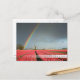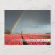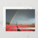 Vykort av en färgrik regnbåge i en mörk himmel över en väderkvarn och en åker full av ljusröda tulpaner under en vårstorm i ett landskap nära Amsterdam i Nederländerna med en urblekt bar och texten: 'Nederländerna'.