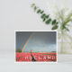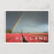 Kort med en färgstark regnbåge i mörk himlar över en kvarn och en fält fullt ljusröda tulpaner under en storm i vår nära Amsterdam i Nederländerna med vit kant och texten: "Holland".