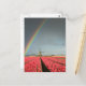 Lodrät-vykort av en färgstark regnbåge i mörk himmel över kvarn och fält fullt av ljusröda tulpaner under en storm i vår i ett landskap nära Amsterdam i Nederländerna.