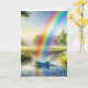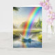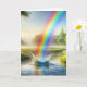 En vibrerande regnbåge samlas i en serenflod i vatten stänk, omgiven av lush grey och avlägsna träd. Texten kan ändras.