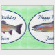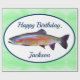 Denna färgrika regnbågeforell över engrönt bakgrund är perfekt för forellfisher'sens födelsedag, pension och mer.
