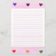 Denna brevpapper är perfekt för valentines och när som helst. Det finns sex hjärtor sammanlagt, målat i färgerna av regnbågen på en blandad rosa bakgrund, presenterat upptill och nedersta av brevpapperet. Centrerahandstilområdet presenterar rosa linjer på en vitbakgrund. Hjärtorna är röda, orange, görar grön, slösar, violeten och lilor.