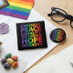 Denna djärva regnbågsfärgade textdesign med ordkonst framhäver orden vänlighet, fred, jämställdhet, inkludering, hopp och mångfald mot en svart bakgrund. Den ljusa flerfärgade texten skapar ett kraftfullt budskap om stöd, acceptans och positivitet med en ren och kontrastrik look. Den staplade typografin gör designen lätt att läsa samtidigt som den ger den en modern, iögonfallande stil. En bra passform för inkluderande uttryck, allierat stöd och stolthetsinspirerade teman.