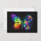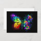 Regnbåge, luminös, artificiellt målad monarch butterfly med bukett av iridescent, starkt, luminiscent ro mot svart bakgrund. Regnbågfjäril.