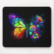 Regnbåge, luminös, artificiellt målad monarch butterfly med bukett av iridescent, starkt, luminiscent ro mot svart bakgrund. Regnbågfjäril.