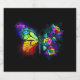 Regnbåge, luminös, artificiellt målad monarch butterfly med bukett av iridescent, starkt, luminiscent ro mot svart bakgrund. Regnbågfjäril.