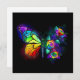 Regnbåge, luminös, artificiellt målad monarch butterfly med bukett av iridescent, starkt, luminiscent ro mot svart bakgrund. Regnbågfjäril.