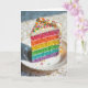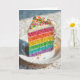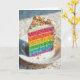 En vibrerande regnbågskaka med sex färgade lagrar fylls med vit frost och sprinkler. Inre text kan ändras.