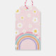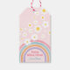 Söta och retro presenttaggar med regnbåge och blommor. Ge din festdekoration lite blommig kraft med denna söta design. Perfekt för hippie- och retrotema. Ung och vild och tre, två vilda, två groovy, groovy en, osv.