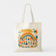 En livfull handväska med barn som håller varandra i händerna under en regnbåge, omgiven av blommor, sol och ballonger. Perfekt för evenemang i lokalsamhället, presenter till barn eller någon som älskar glada och uppiggande mönster.