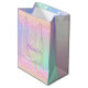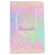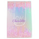 En regnbåge, enhörning holografisk bakgrund i rosa, lila, roséguld och mintgrön med falska glittrande droppar, målade droppande utseende. Anpassa och ett namn och monogram initialer. Namnet skrivs med en trendig handskriven stilsnurr.