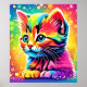 En fängslande illustration av en lekfull kattunge badad i en levande regnbåge av färger, mot en stjärnig bakgrund. Detta fantasifulla konstverk är perfekt för att lägga till en touch av magi till alla stilar (Denna design gjord med AI). Beställ idag och omfamna glädjen av shopping!