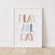 Dekorera ditt lilla barns barnkammare, sovrum eller lekrum med denna akvarell 'lek hela dagen', med regnbågens färger.