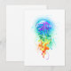Stora, irrande, konstnärligt ritade, ljusa maneter med långa tentakler på vitt, målade över med flerfärgad vattenfärgad bakgrund. Regnbågsnäcka.