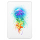 Stora, irrande, konstnärligt ritade, ljusa maneter med långa tentakler på vitt, målade över med flerfärgad vattenfärgad bakgrund. Regnbågsnäcka.