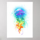 Stora, irrande, konstnärligt ritade, ljusa maneter med långa tentakler på vitt, målade över med flerfärgad vattenfärgad bakgrund. Regnbågsnäcka.
