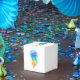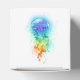 Stora, irrande, konstnärligt ritade, ljusa maneter med långa tentakler på vitt, målade över med flerfärgad vattenfärgad bakgrund. Regnbågsnäcka.