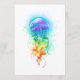 Stora, irrande, konstnärligt ritade, ljusa maneter med långa tentakler på vitt, målade över med flerfärgad vattenfärgad bakgrund. Regnbågsnäcka.