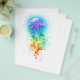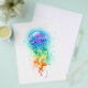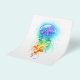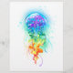 Stora, irrande, konstnärligt ritade, ljusa maneter med långa tentakler på vitt, målade över med flerfärgad vattenfärgad bakgrund. Regnbågsnäcka.
