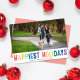 Den här roliga julkortet har regnbågstypografi mot en vit bakgrund med ett liggande foto. Greetings på framsidan är "Happiest Holidays". Designen rymmer ett liggande foto på framsidan av kortet. På baksidan hittar du ett festligt rött och vitt diagonalt randmönster som kan tas bort eller anpassas. Du kan också lägga till ett annat foto eller text på baksidan genom att välja "Anpassa designen ytterligare".