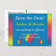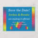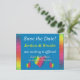 En enkel men elegant design som visar den viktiga informationen tydligt och lättläst. Den solida bakgrunden med en touch av regnbågsfärg gör det här vykortet svårt att missa i brevlådan! Välj valfri färg till bakgrunden (visas här med en dunkelblå framtill och vit baktill). Baksidan är förformaterad för både avsändarens och mottagarens adress. Om du hellre vill skriva adressen för hand på dina Save the Dates, lämna helt enkelt mottagarens adressfält tomma. Använd de medföljande mallfälten för att snabbt anpassa med din information. Klicka på "anpassa ytterligare" för att ändra teckensnitt, storlek, färger och positioner.