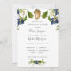 Den här designen omger dina ceremoniella repetitions- och middagsdetaljer med raustiskt löv, blommor och hörn som är målade i en delikat palett med grönt och grå vattenfärgsfärg, med fast blåa blommor