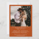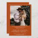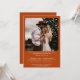 Den här snyggtens rostiga orange eller den brinnande middagsinbjudan från bröllop i färgad är modern, chicen och minimalistisk. Den innehåller ett foto av paret med undertext som innehåller all relevant information om både bröllop-repetitionen och middagen som ska följa. Enkel, vacker och elegant.
