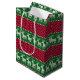 A playful faux-knit design featuring rows of white reindeer marching across festive red and green stripes. Classic Christmas sweater style for cozy cheer.