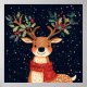 En renare från lycklig, försedd med hullbär och mistletoe i sina borrmaskiner, mot en magisk blå natt himmel fylld med stjärnor.